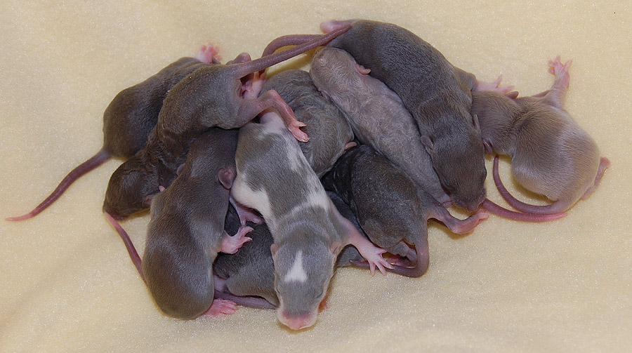 Lovely harleys, harvels, velveteens and standard coats, all carrying harley, in Russian blue and possibly colorpoint, all dumbo. These babies should have fantastic personalities. Their mom is one of our most outgoing girls and their dad is so gentle and mellow. Babies will be named for Shakespearean characters, just like mom. Pease surpised the heck out of us by having a large litter of 11 a day earlier than expected on June 17. And she did it ninja style, with all babies birthed, cleaned and nursing in an hour!!! Peaseblossom means business with her babies! It looks like we have a nearly even split of 5 boys and 6 girls in the group.